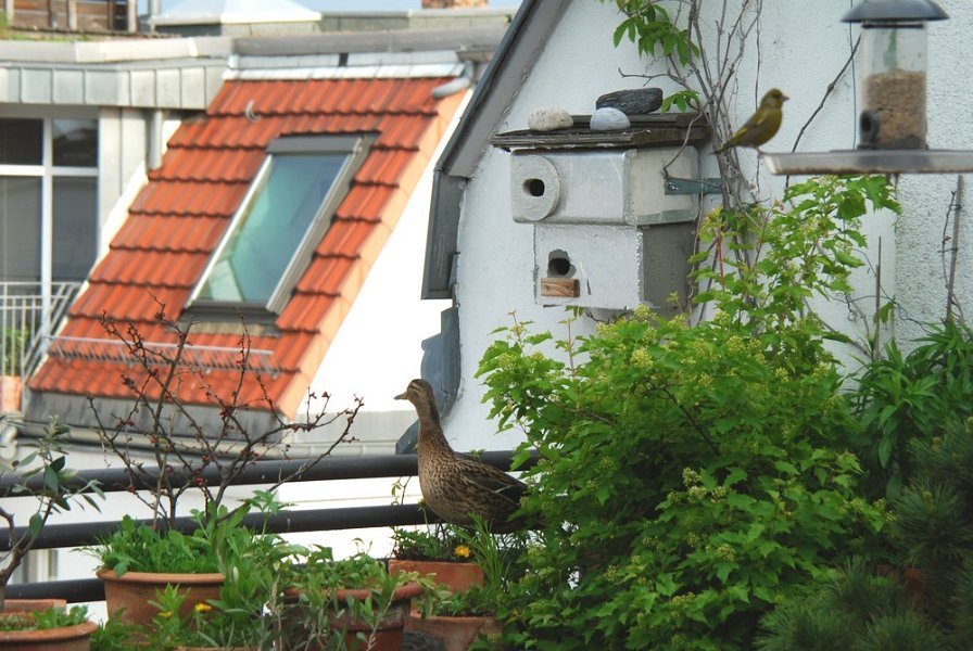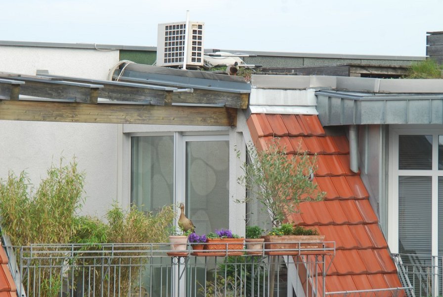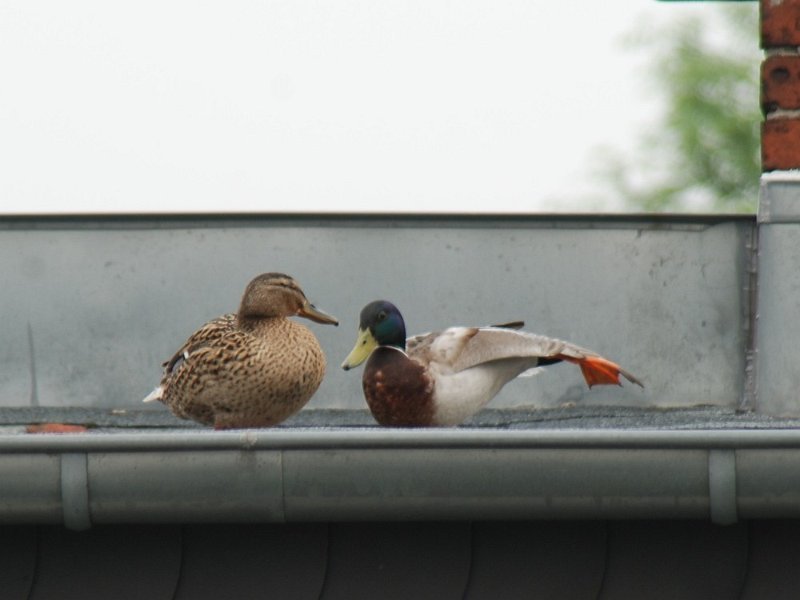 Ein Stockentenpaar, wir nennen sie Konstantin und Konstanze, sondieren den Brutplatz auf der Dachterrasse am 30. April 2010.